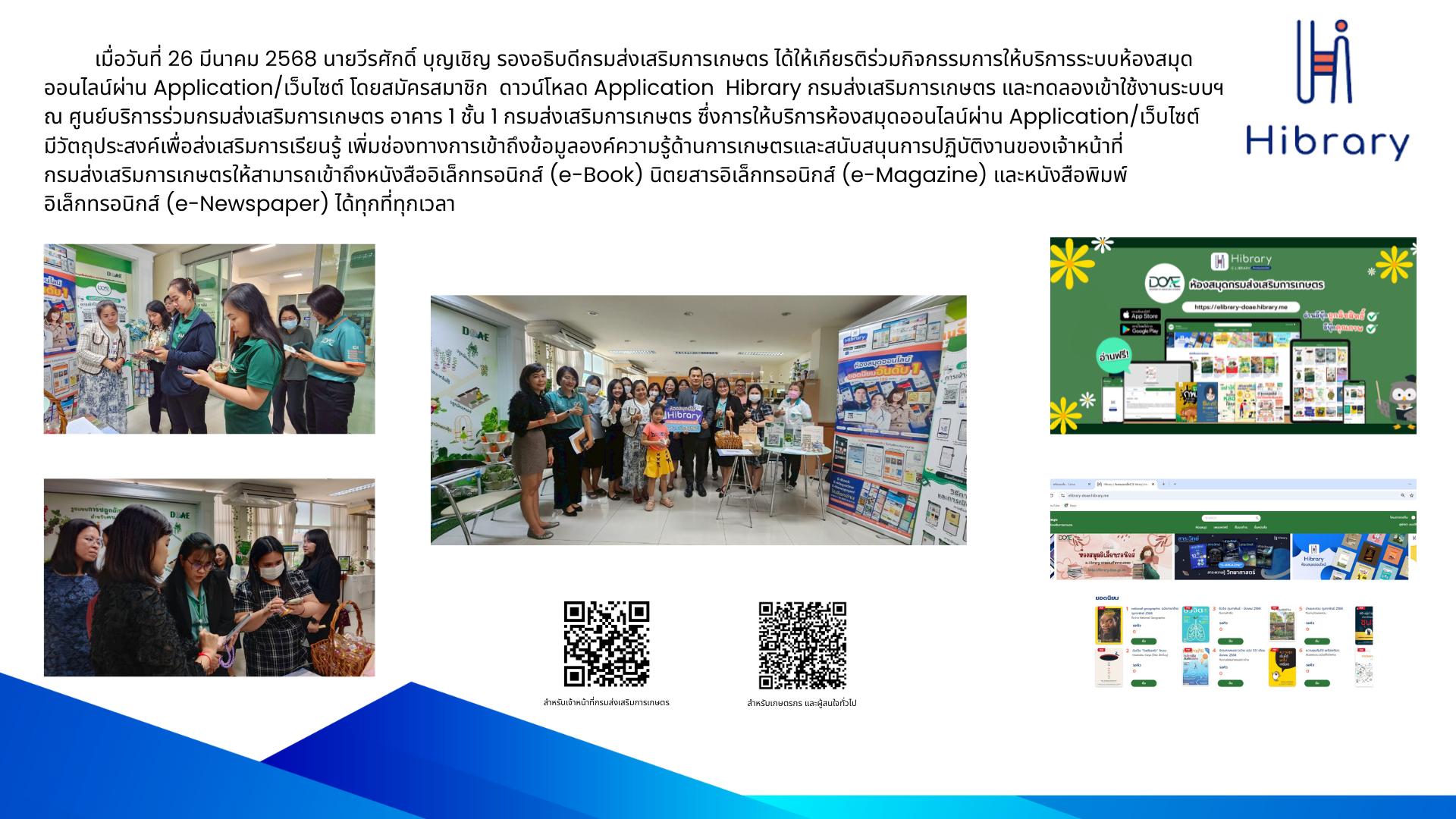 เมื่อวันที่ 26 มีนาคม 2568 นายวีรศักดิ์ บุญเชิญ รองอธิบดีกรมส่งเสริมการเกษตร ได้ให้เกียรติร่วมกิจกรรมการให้บริการห้องสมุดออนไลน์ผ่าน Application/เว็บไซต์ โดยสมัครสมาชิก ดาวน์โหลดและทดลองเข้าใช้งาน