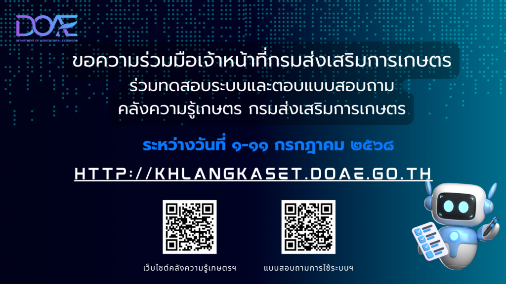 ขอความร่วมมือในการทดสอบระบบเว็บไซต์คลังความรู้เกษตร กรมส่งเสริมการเกษตร ระหว่างวันที่ 1-11 กรกฎาคม 2568 และตอบแบบสอบถามการทดสอบระบบฯ เพื่อนำไปปรับปรุงและพัฒนาการให้บริการได้อย่างรวดเร็ว ครบถ้วน ถูกต้อง ปลอดภัย และมีประสิทธิภาพ ตรงตามวัตถุประสงค์การใช้งานของผู้ใช้บริการ