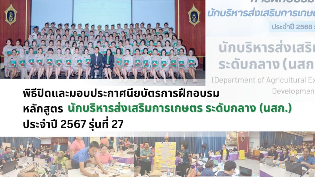 เมื่อวันที่ 15 กรกฎาคม 2568 นายวีรศักดิ์ บุญเชิญ รองอธิบดีกรมส่งเสริมการเกษตร เป็นประธานพิธีปิดการฝึกอบรม หลักสูตร นักบริหารส่งเสริมการเกษตร ระดับกลาง (นสก.) ประจำปี 2568 รุ่นที่ 27 ณ ศูนย์ส่งเสริมและพัฒนาอาชีพเสริมนอกภาคการเกษตร ตำบลช้างใหญ่ อำเภอบางไทร จังหวัดพระนครศรีอยุธยา โดยมีนางอมรทิพย์ ภิรมย์บูรณ์ ผู้อำนวยการสำนักพัฒนาการถ่ายทอดเทคโนโลยีกล่าวรายงาน การดำเนินการจัดฝึกอบรมแบ่งเป็น รูปแบบ Online ระหว่างวันที่ 1 – 4 กรกฎาคม 2568 ณ ห้องถ่ายทอดออนไลน์ ชั้น 3 อาคารส่งเสริมการเกษตรเบญจสิริกิติ์ กรมส่งเสริมการเกษตร และ รูปแบบ Onsite ระหว่างวันที่ 7 – 15 กรกฎาคม 2568 ณ ศูนย์ส่งเสริมและพัฒนาอาชีพเสริมนอกภาคการเกษตร ตำบลช้างใหญ่ อำเภอบางไทร จังหวัดพระนครศรีอยุธยา และศึกษาดูงาน ณ กลุ่มวิสาหกิจชุมชนกล้วยหอมทองปทุมรัตน์ ตำบลนพรัตน์ อำเภอหนองเสือ จังหวัดปทุมธานี และศูนย์จัดการศัตรูพืชชุมชน ตำบลบึงคอไห อำเภอลำลูกกาจังหวัดปทุมธานี โดยมีผู้เข้ารับการฝึกอบรม และผ่านการฝึกอบรม จำนวนทั้งสิ้น 100 คน