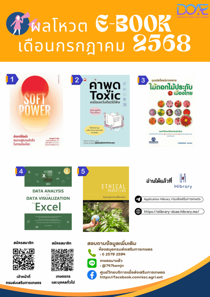 สอบถามข้อมูลเพิ่มเติม : ห้องสมุดกรมส่งเสริมการเกษตร โทร. 0 2579 2594 หรือ Line เกษตรมาแล้ว @747kemjn