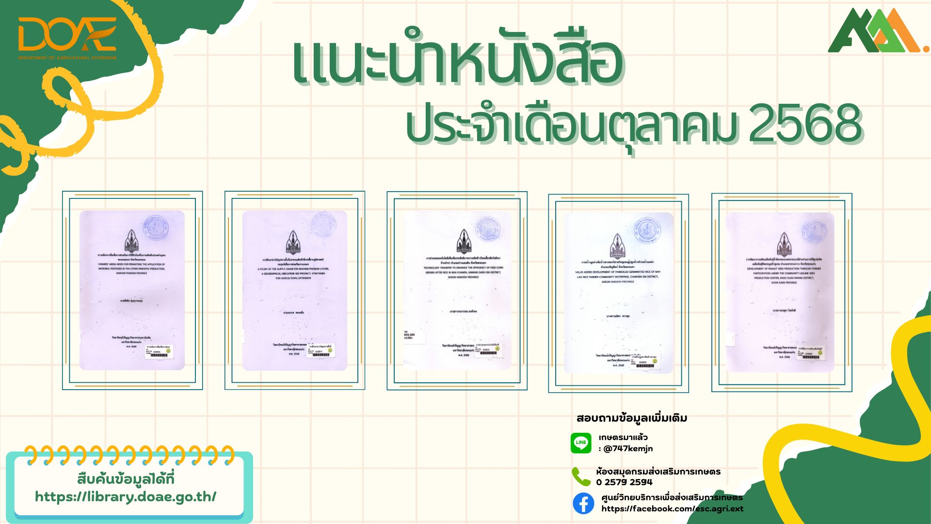 ห้องสมุดกรมส่งเสริมการเกษตร โทร. 0 2579 2594 หรือ Line เกษตรมาแล้ว ID LINE @747kemjn