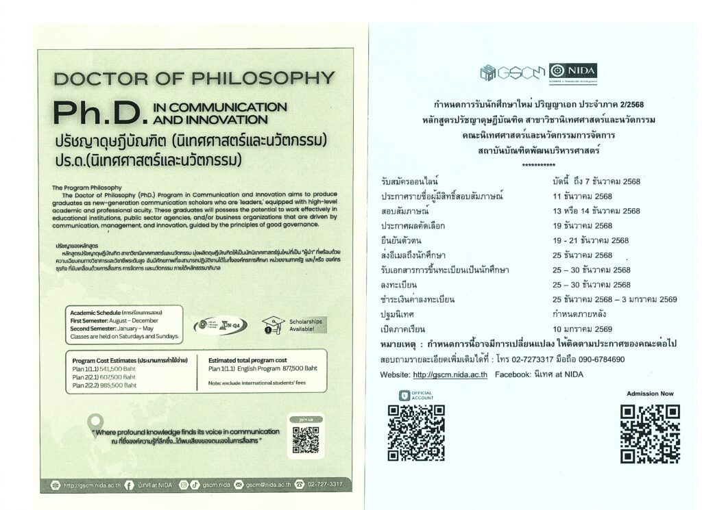 สถาบันบัณฑิตพัฒนบริหารศาตร์ รับสมัครนักศึกษา ศึกษาต่อในระดับปริญญาเอก ประจำภาค 2/2568 หลักสูตรปรัชญาดุษฎีบัณฑิต สาขาวิชานิเทศศาสตร์และนวัตกรรม ตั้งแต่บัดนี้ – 7 ธันวาคม 2568