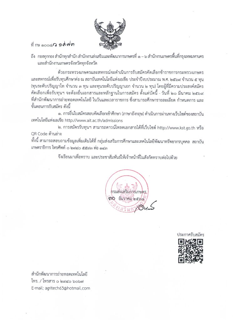ด้วยกระทรวงเกษตรและสหกรณ์จะดำเนินการรับสมัครคัดเลือกข้าราชการกระทรวงเกษตรและสหกรณ์ เพื่อรับทุนศึกษาต่อ ณ สถาบันเทคโนโลยีแห่งเอเชีย ประจำปีงบประมาณ พ.ศ. 2569 จำนวน 5 ทุน (ทุนระดับปริญญาโท จำนวน 3 ทุน และทุนระดับปริญญาเอก จำนวน 2 ทุน) โดยผู้ที่มีความประสงค์สมัครคัดเลือก เพื่อรับทุนฯ จะต้องยื่นเอกสารและหลักฐานในการสมัคร ตั้งแต่บัดนี้ – วันที่ 20 มีนาคม 2569