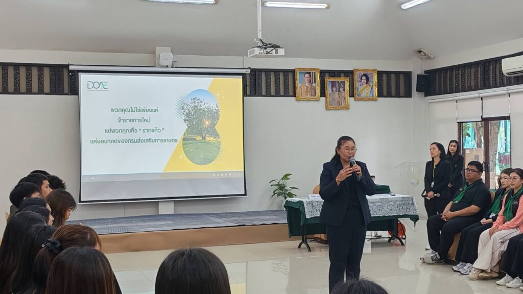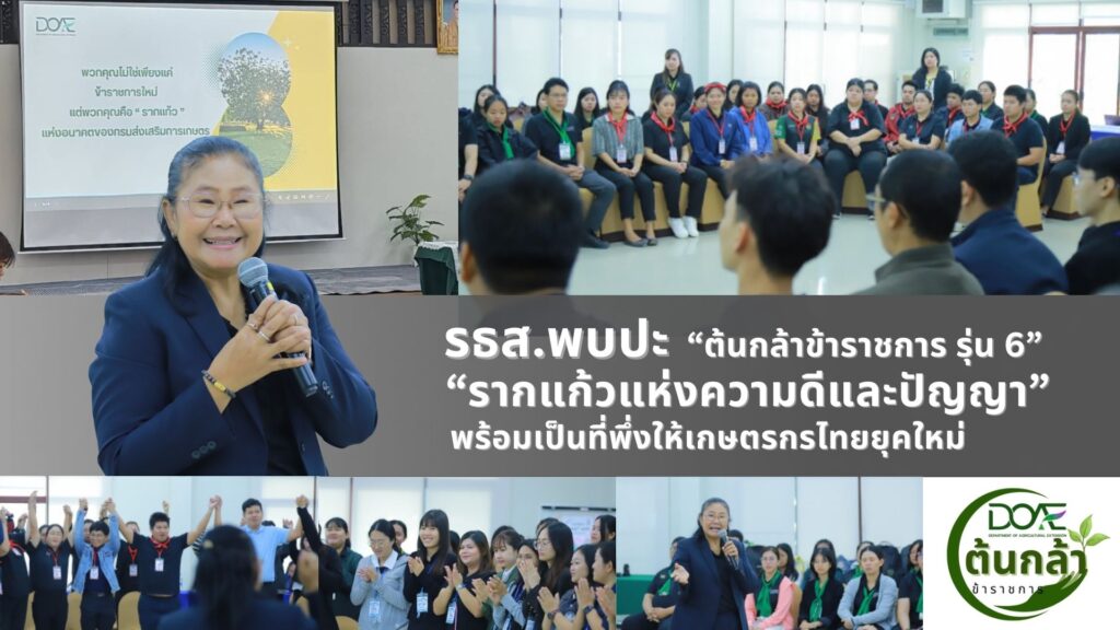 (15 มกราคม 2569) นางธัญธิตา บุญญมณีกุล รองอธิบดีกรมส่งเสริมการเกษตร ให้เกียรติมาพบปะและบรรยายพิเศษใน หลักสูตร “ต้นกล้าข้าราชการ รุ่นที่ 6” โดยมีข้าราชการบรรจุใหม่เข้ารับการอบรมจำนวนทั้งสิ้น 78 คน โดยดำเนินการจัดในรูปแบบผสมผสาน คือ รูปแบบออนไลน์ (ONLINE TRAINING) ระหว่างวันที่ 6 – 9 มกราคม 2569 ณ ห้องถ่ายทอดออนไลน์ ชั้น 3 อาคารส่งเสริมการเกษตรเบญจสิริกิติ์ กรมส่งเสริมการเกษตร และรูปแบบเผชิญหน้า (ONSITE TRAINING) ระหว่างวันที่ 13 – 16 มกราคม 2569 ณ สำนักงานพิพิธภัณฑ์เกษตรเฉลิมพระเกียรติพระบาทสมเด็จพระเจ้าอยู่หัว (องค์การมหาชน) จังหวัดปทุมธานี