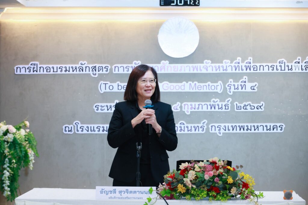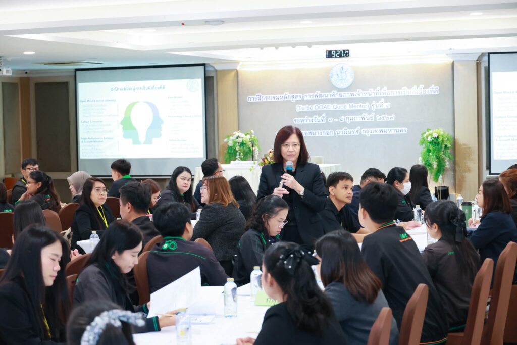 วันจันทร์ที่ 2 กุมภาพันธ์ 2569 เวลา 09.00 น. นางอัญชลี สุวจิตตานนท์ อธิบดีกรมส่งเสริมการเกษตร ให้เกียรติบรรยายพิเศษ หัวข้อ เมื่อเวทีแห่งนี้มีพี่เลี้ยง ในหลักสูตร การพัฒนาศักยภาพเจ้าหน้าที่เพื่อการเป็นพี่เลี้ยงที่ดี (TO BE DOAE GOOD MENTOR) รุ่นที่ 4 ซึ่งจัดขึ้นระหว่างวันที่ 1 – 4 กุมภาพันธ์ 2569 ณ โรงแรมเอสบางกอก นวมินทร์ กรุงเทพมหานคร