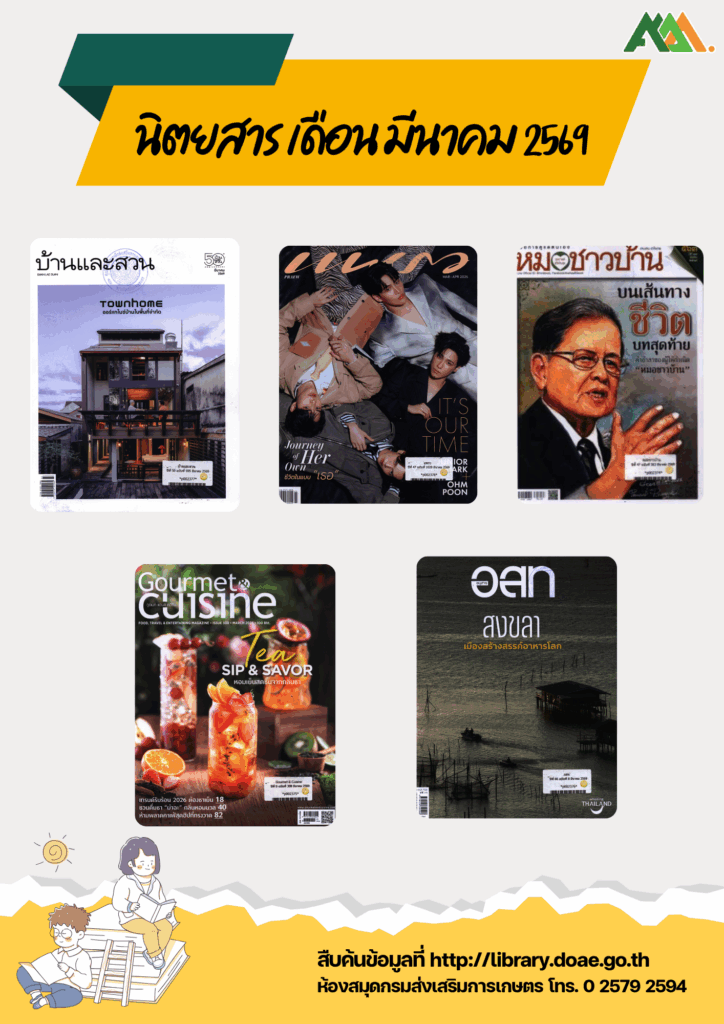 ห้องสมุดกรมส่งเสริมการเกษตร แนะนำนิตยสารใหม่ เดือนมีนาคม 2569 สามารถเข้ามารับบริการการอ่านได้ที่ ห้องสมุดกรมส่งเสริมการเกษตร อาคารส่งเสริมการเกษตรเบญจสิริกิติ์ ชั้น 5 (ห้องสมุดกรมส่งเสริมการเกษตร)