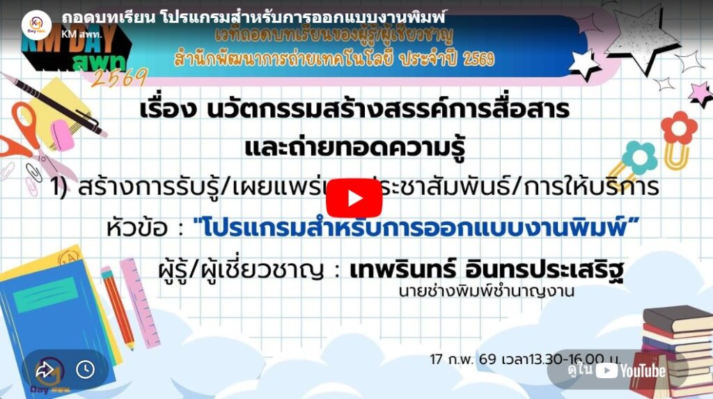 จำนวนผู้เข้าชม : 0 KM Day สพท. ประจำปี 2569 หัวข้อ “โปรแกรมสำหรับการออกแบบงานพิมพ์”ผู้รู้/ผู้เชี่ยวชาญ : เทพรินทร์ อินทรประเสริฐ นายช่างพิมพ์ชำนาญงานวันอังคารที่ 17 กุมภาพันธ์ 2569 เวลา 13.30-16.00 น./Zoom Meeting Post navigation KM Day สพท. ประจำปี 2569 1. หัวข้อ “การสร้างสื่อส่งเสริมการเกษตรด้วย canva” KM Day สพท. ประจำปี 2569 3. หัวข้อ “การใช้ Facebook ส่วนบุคคลเป็นเครื่องมือสื่อสารและประชาสัมพันธ์งานอย่างสร้างสรรค์ ”