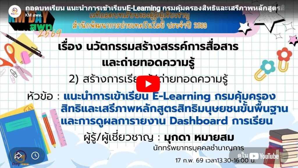 KM Day สพท. ประจำปี 2569 5. หัวข้อ “แนะนำการเข้าเรียน E-Learning กรมคุ้มครองสิทธิและเสรีภาพหลักสูตรสิทธิมนุษยชนขั้นพื้นฐานและการดูผลรายงาน Dashboard การเรียน”