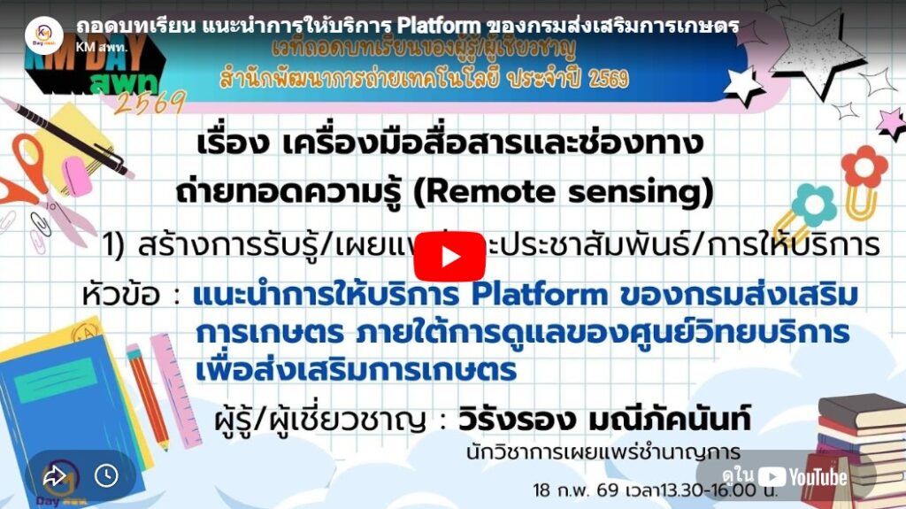 KM Day สพท. ประจำปี 2569 6. หัวข้อ “แนะนำการให้บริการ Platform ของกรมส่งเสริมการเกษตรการเกษตร ภายใต้การดูแลของศูนย์วิทยบริการเพื่อส่งเสริมการเกษตร”