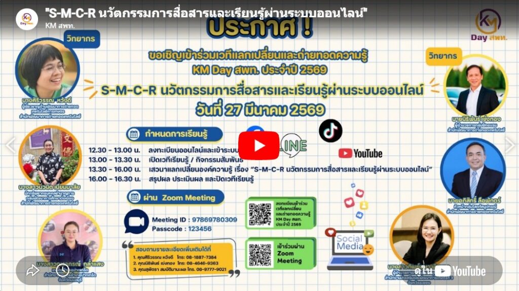จำนวนผู้เข้าชม : 3 KM Day สพท. ประจำปี 2569 หัวข้อ S-M-C-R นวัตกรรมการสื่อสารและเรียนรู้ผ่านระบบออนไลน์ วันที่ 27 มีนาคม 2569 เวลา 12.30-16.00 น./Zoom Meeting Post navigation แนะนำนิตยสาร ประจำเดือนมีนาคม 2569 ขอเชิญร่วมกิจกรรม เปิดบ้าน “คลังความรู้เกษตร กรมส่งเสริมการเกษตร”