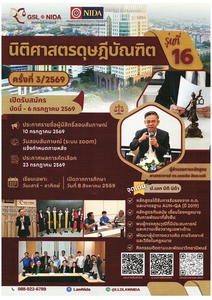 คณะนิติศาสตร์ สถาบันบัณฑิตพัฒนบริหารศาสตร์ เปิดรับสมัครนักศึกษาในหลักสูตรนิติศาสตรดุษฎีบัณฑิต รุ่นที่ 16 ตั้งแต่บัดนี้ – 6 กรกฎาคม 2569