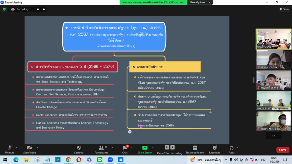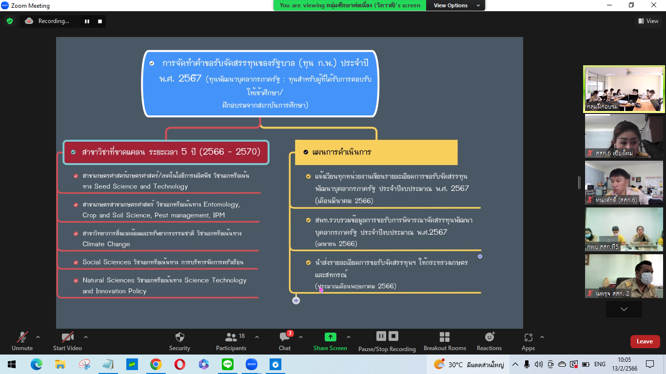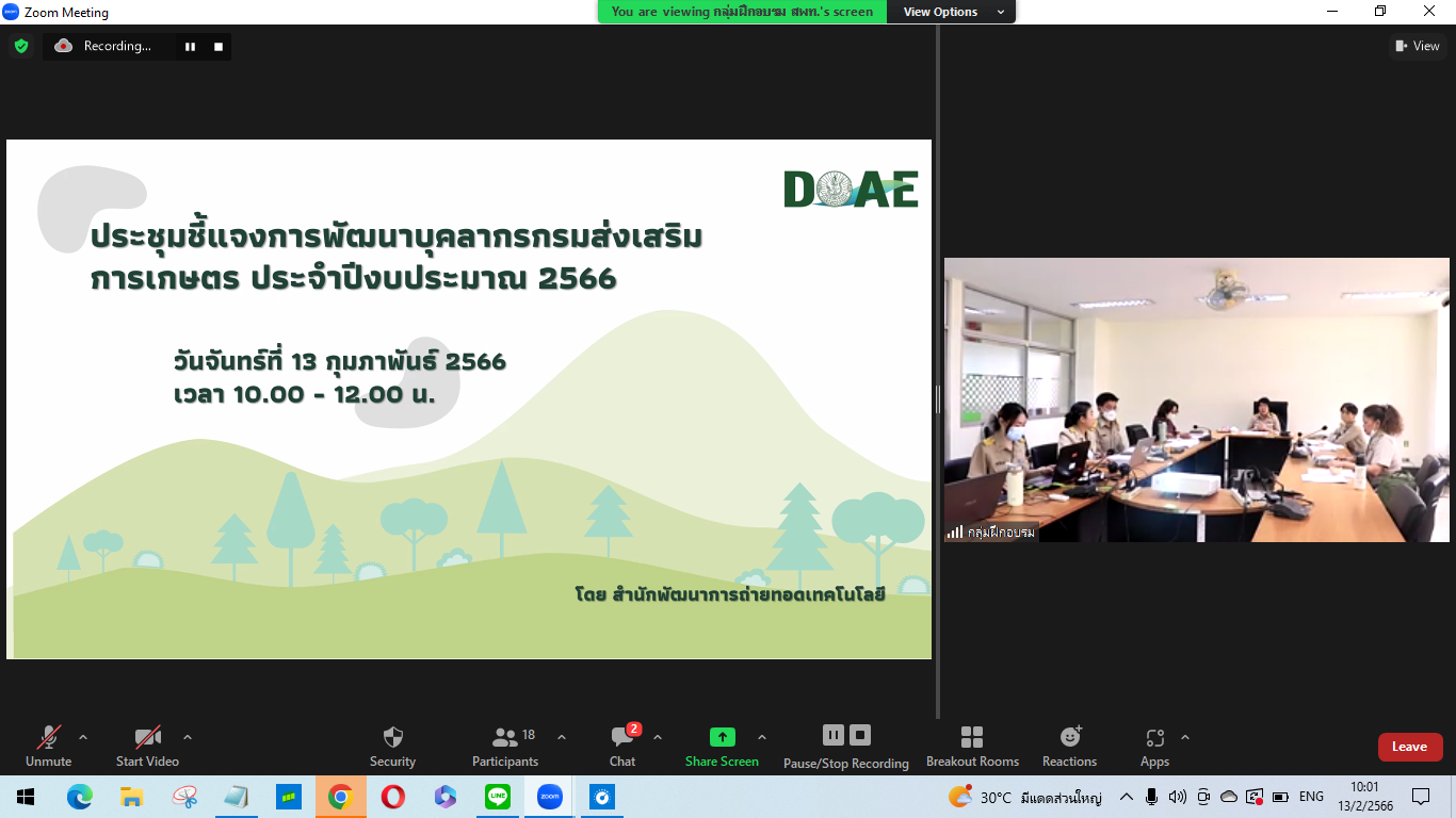 วันจันทร์ที่ 13 กุมภาพันธ์ 2566 เวลา 10.00 – 12.00 น. นางอมรทิพย์ ภิรมย์บูรณ์ เป็นประธานที่ประชุมการชี้แจงหลักสูตรการพัฒนาบุคลากรกรมส่งเสริมการเกษตร ประจำปีงบประมาณ 2566 โดยประชุมร่วมกับสำนักงานส่งเสริมและพัฒนาการเกษตรที่ 1 – 6 ร่วมวางแผนการดำเนินโครงการพัฒนาบุคลากรประจำปี 2566 อาทิ ทุนพัฒนาบุคลากร โครงการ Doae Onboarding Program หลักสูตร เทคโนโลยีด้านการเกษตร พัฒนานักส่งเสริมการเกษตรมืออาชีพ โครงการฝึกอบรมข้าราชการที่อยู่ระหว่างทดลองปฏิบัติหน้าที่ราชการ หลักสูตร “การเป็นข้าราชการที่ดี” ประจำปีงบประมาณ 2566 รุ่นที่ 3