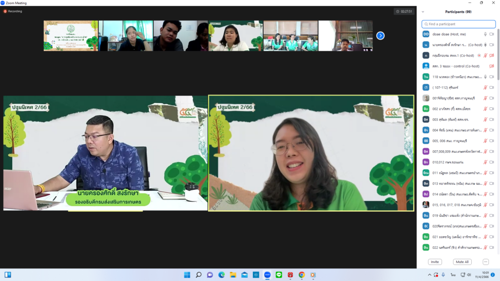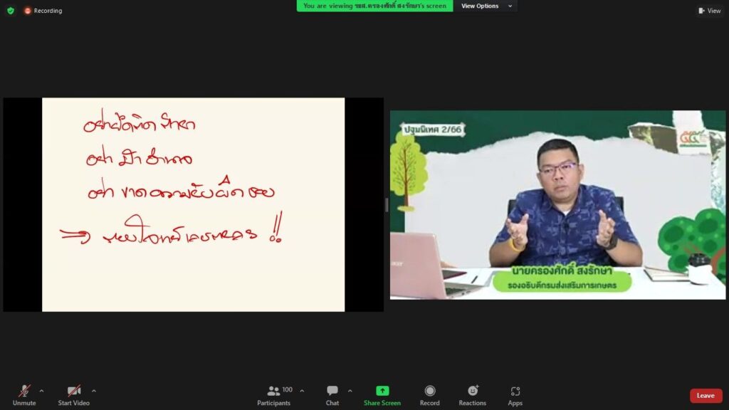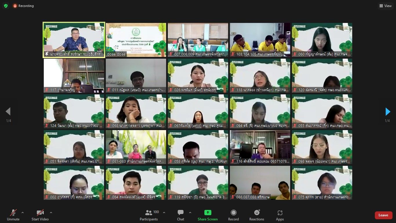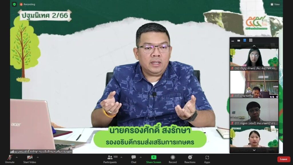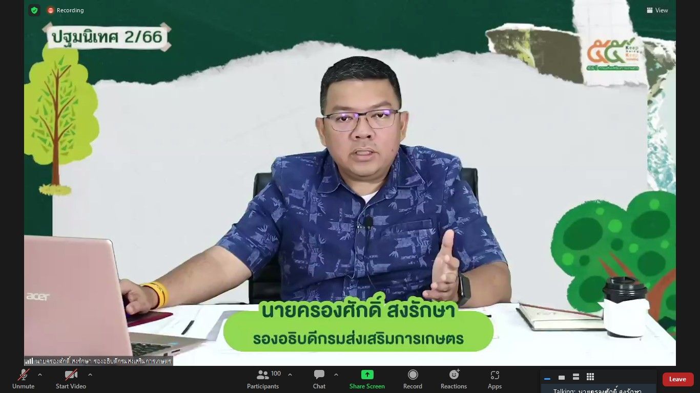 Zoom Meeting ณ ห้องถ่ายทอดออนไลน์ ชั้น 3 อาคารส่งเสริมการเกษตรเบญจสิริกิติ์ กรมส่งเสริมการเกษตร บุคคลเป้าหมายในการฝึกอบรม ประกอบด้วย นักวิชาการส่งเสริมการเกษตรปฏิบัติการ