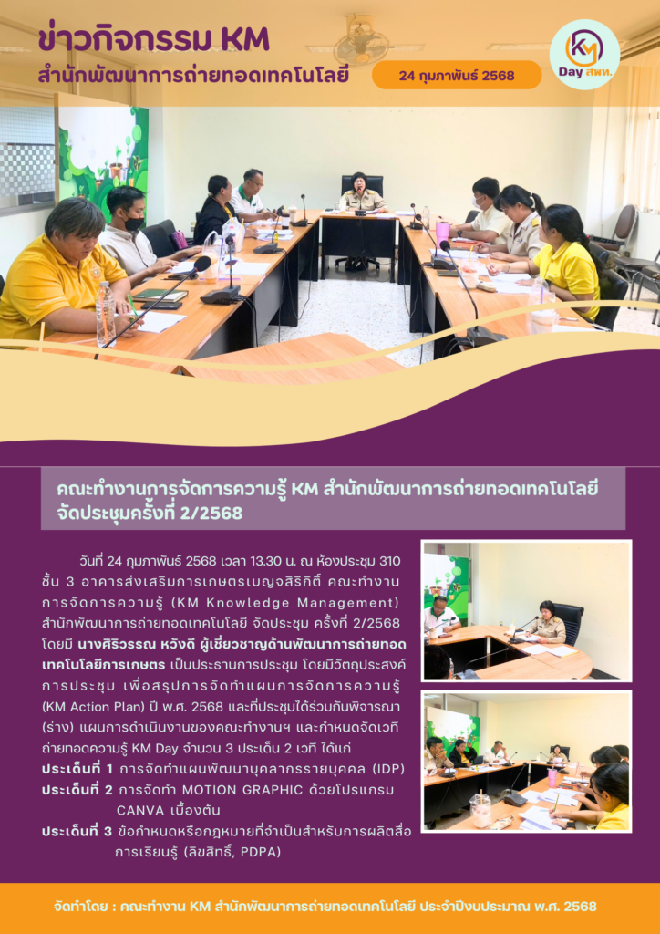 จำนวนผู้เข้าชม : 14 ข่าวกิจกรรม KM สำนักพัฒนาการถ่ายทอดเทคโนโลยีคณะทำงานการจัดการความรู้ KM สำนักพัฒนาการถ่ายทอดเทคโนโลยี จัดประชุมครั้งที่ 2/2568 Post navigation 1. คณะทำงานการจัดการความรู้ KM สพท. จัดประชุมครั้งที่ 1/2568 3. คณะทำงานการจัดการความรู้ KM สพท. จัดประชุมครั้งที่ 3/2568